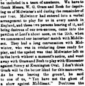 Midwinter played for Australia in the very first Test match in 1877 but on June 20 1878, as he was preparing to play for the touring Australians against Middlesex at Lord’s, he was sensationally kidnapped by Dr WG Grace and driven across London to The Oval to play with Grace’s team Gloucestershire.